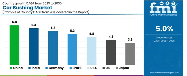 Revenue from Car Bushings in India is expanding to reach USD 2,287.6 million by 2035, supported by extensive automotive sector expansion and comprehensive vehicle manufacturing development creating demand for reliable bushing solutions across diverse passenger vehicle categories and commercial transportation segments. The country's growing automotive production capacity and expanding vehicle ownership are driving demand for component solutions that provide consistent performance while supporting cost-effective manufacturing requirements. Component manufacturers and automotive suppliers are investing in local production facilities to support growing manufacturing operations and domestic market demand.