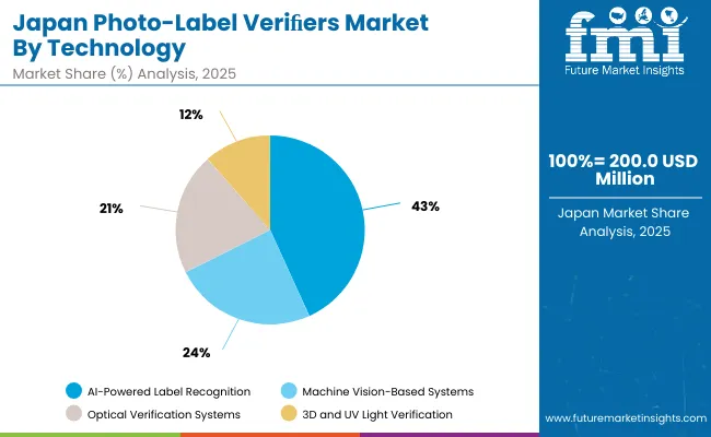 Japan’s photo-label verifiers market, valued at USD 200.0 million in 2025, is dominated by AI-powered label recognition systems due to their unmatched accuracy and automation compatibility. Machine vision-based systems continue to grow in demand, enabling real-time defect detection on high-speed production lines. Optical verification systems remain essential in pharmaceutical and food labeling compliance, while 3D and UV light verification ensures security against counterfeit packaging. Japan’s advanced industrial base drives integration of intelligent, data-driven label inspection solutions.